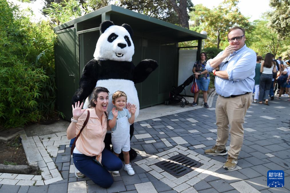 9月20日,在西班牙马德里动物园,游客们与熊猫人偶合影。新华社发(古斯塔沃·巴连特摄)