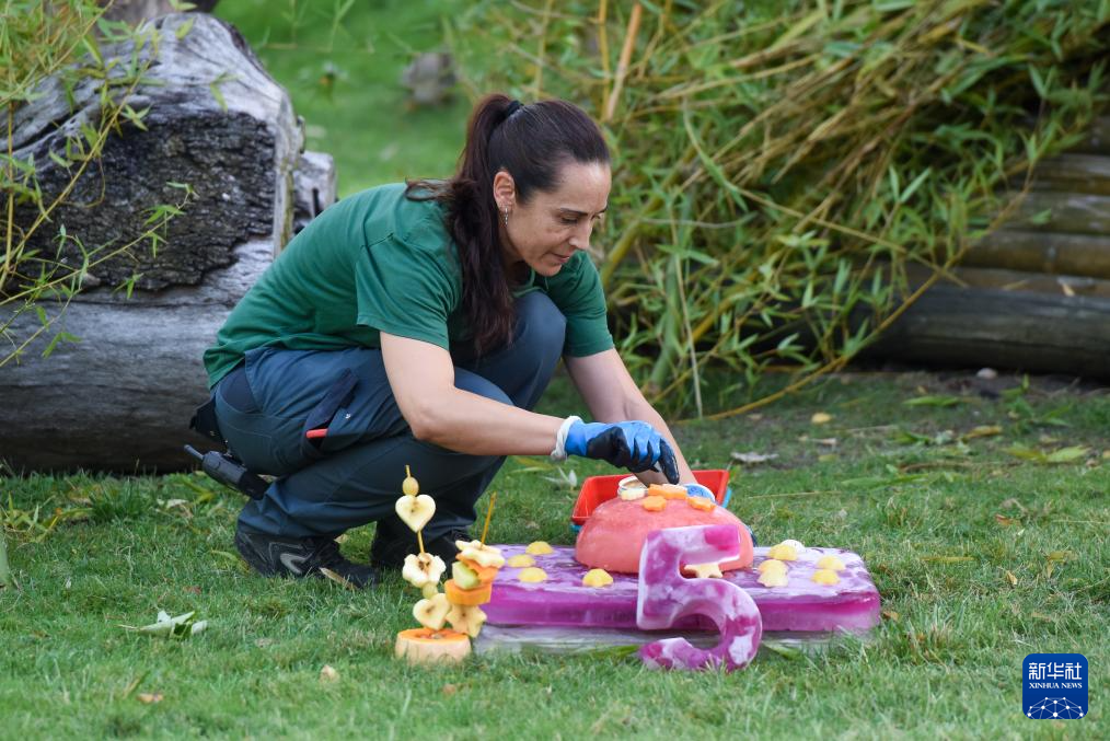9月20日,在西班牙马德里动物园,饲养员为大熊猫准备生日“蛋糕”。新华社发(古斯塔沃·巴连特摄)
