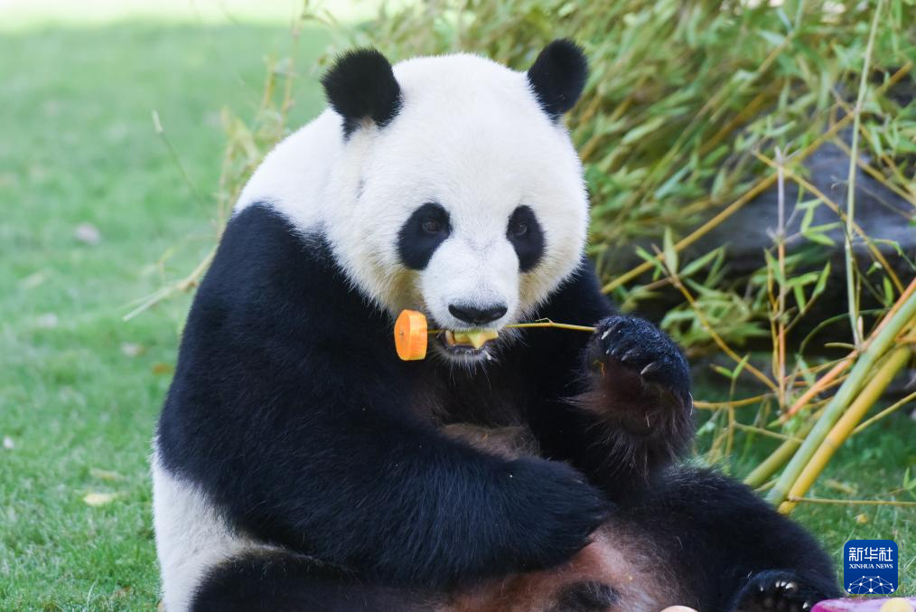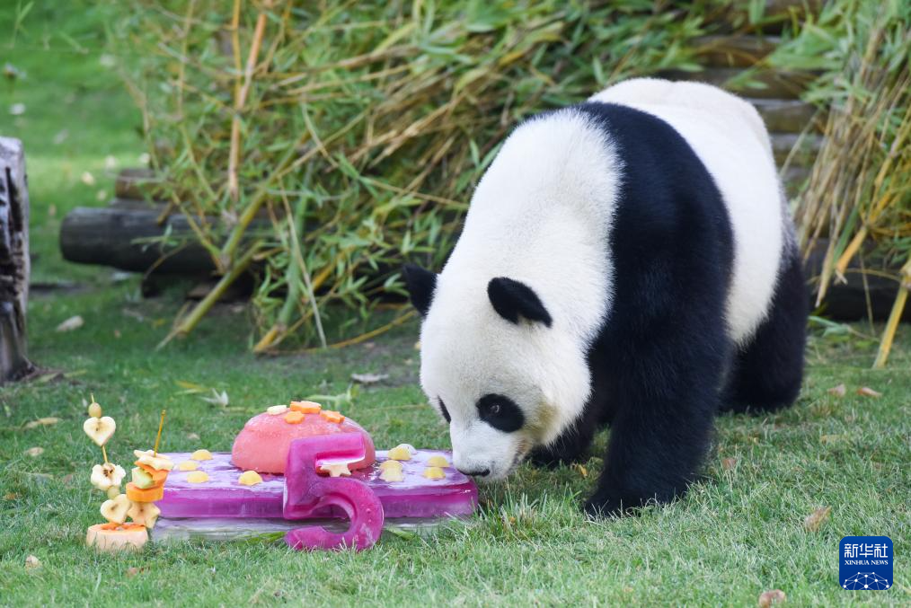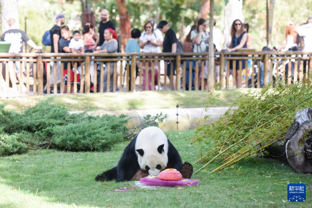 9月20日,在西班牙马德里动物园,大熊猫“金喜”享用生日“蛋糕”。新华社发(古斯塔沃·巴连特摄)