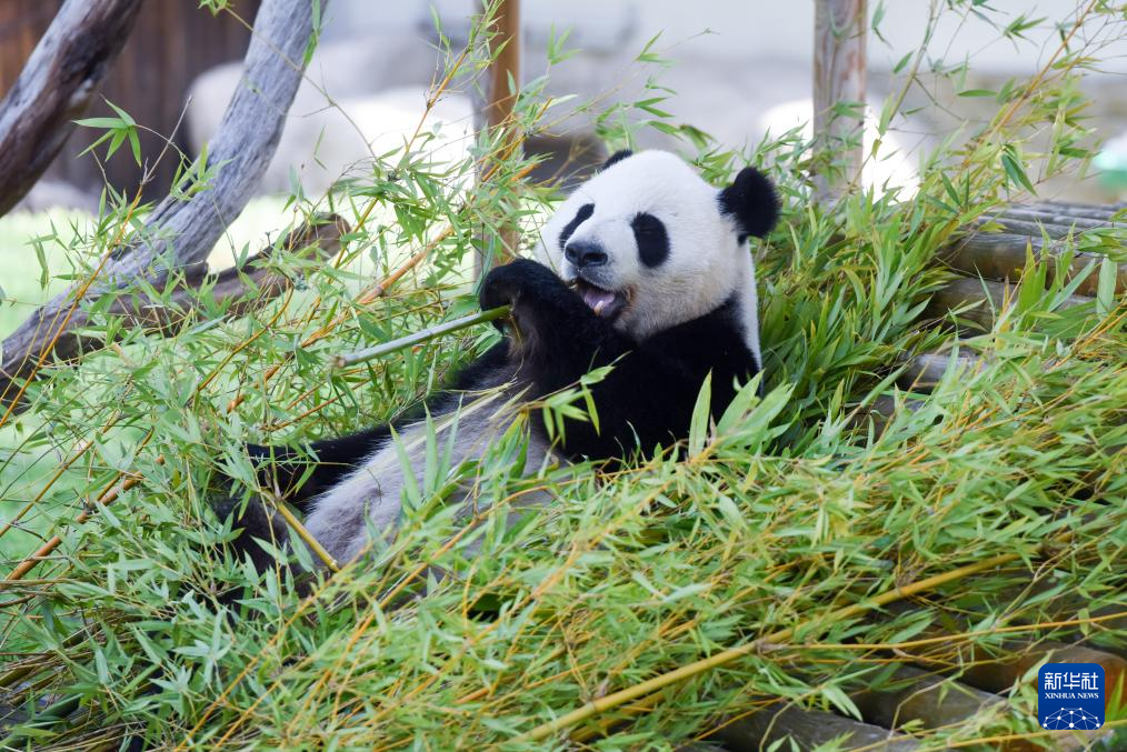 9月20日,在西班牙马德里动物园,大熊猫“金喜”在吃竹子。新华社发(古斯塔沃·巴连特摄)