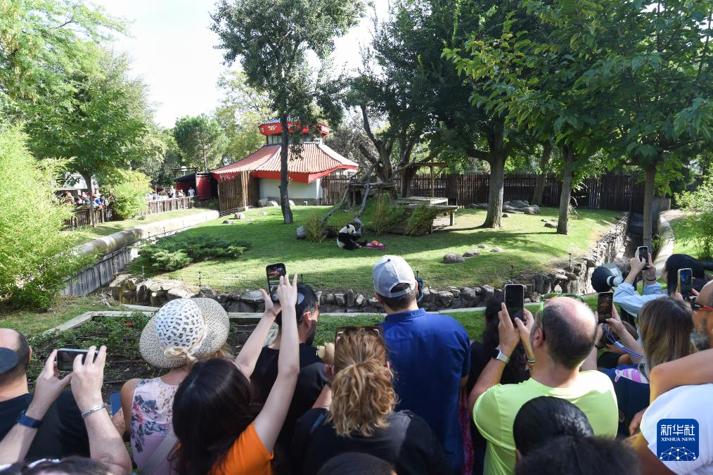 9月20日,在西班牙马德里动物园,游客们与大熊猫“金喜”互动。新华社发(古斯塔沃·巴连特摄)