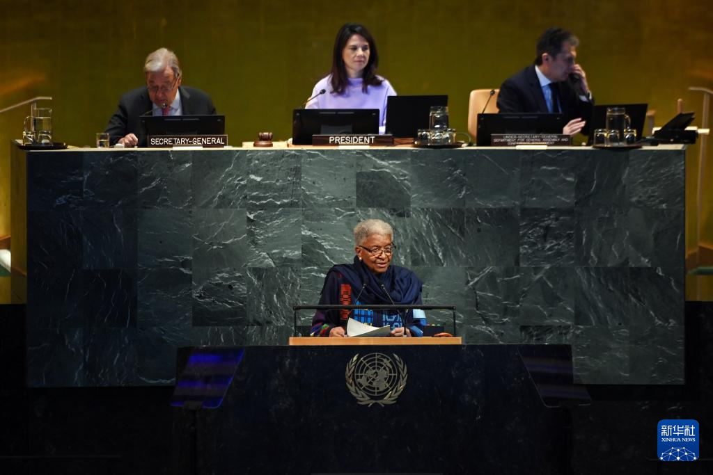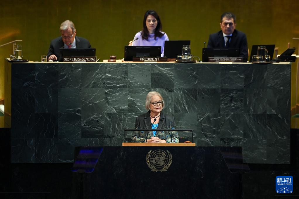 9月22日,在位于纽约的联合国总部,第80届联合国大会主席安娜莱娜·贝尔伯克(前)在纪念联合国成立80周年高级别会议上讲话。新华社记者 李睿 摄