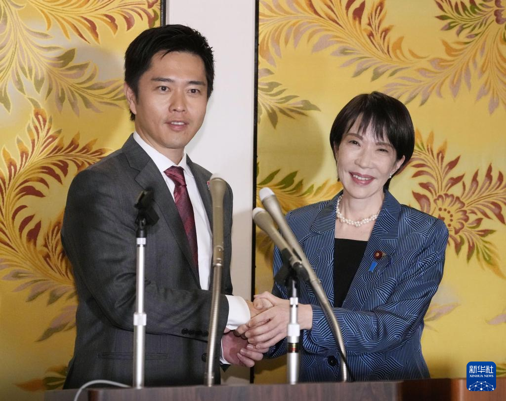 10月20日,在位于日本东京的日本国会,日本自民党总裁高市早苗(右)与维新会党首吉村洋文在记者会上握手。新华社/共同社