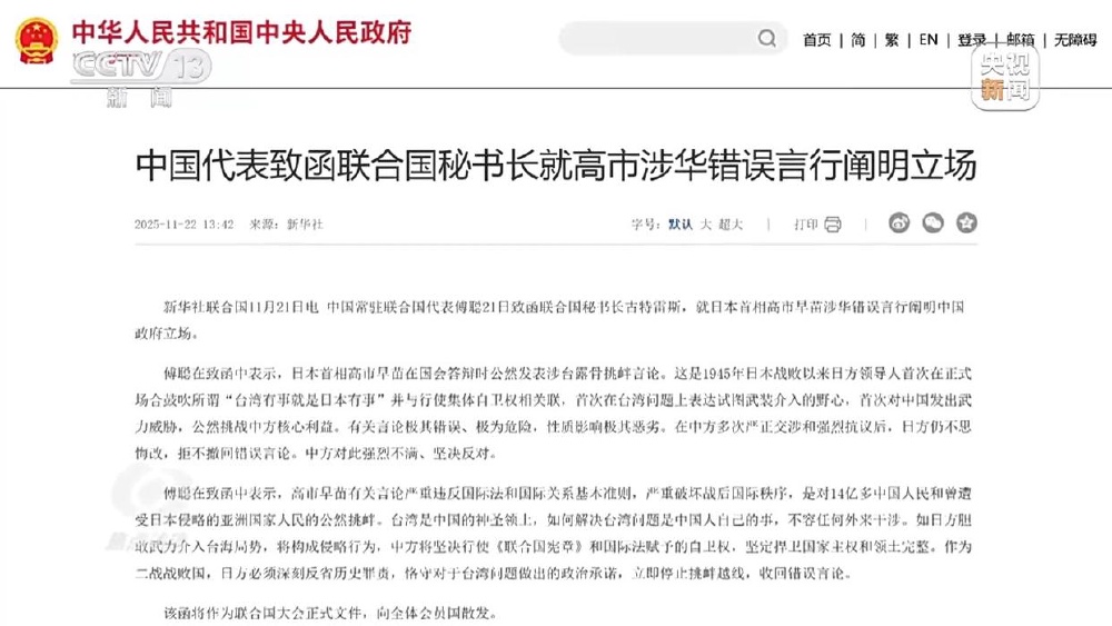 中国常驻联合国代表傅聪11月21日致函联合国秘书长古特雷斯,就高市早苗涉华错误言行阐明中国政府立场:如日方胆敢武力介入台海局势,中方将坚定捍卫国家主权和领土完整。高市的涉台错误言论粗暴干涉他国内政,更对中日关系和地区稳定造成直接的冲击。