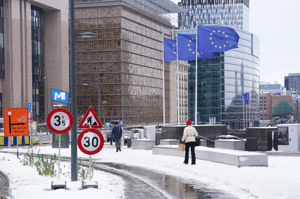 1月7日,在比利时布鲁塞尔,市民在雪中步行。新华社记者 彭子洋 摄