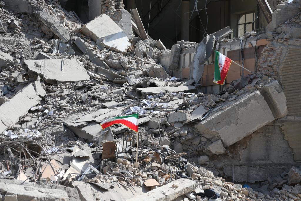 这是3月4日在伊朗德黑兰革命广场附近拍摄的一处损毁的建筑。新华社记者沙达提摄