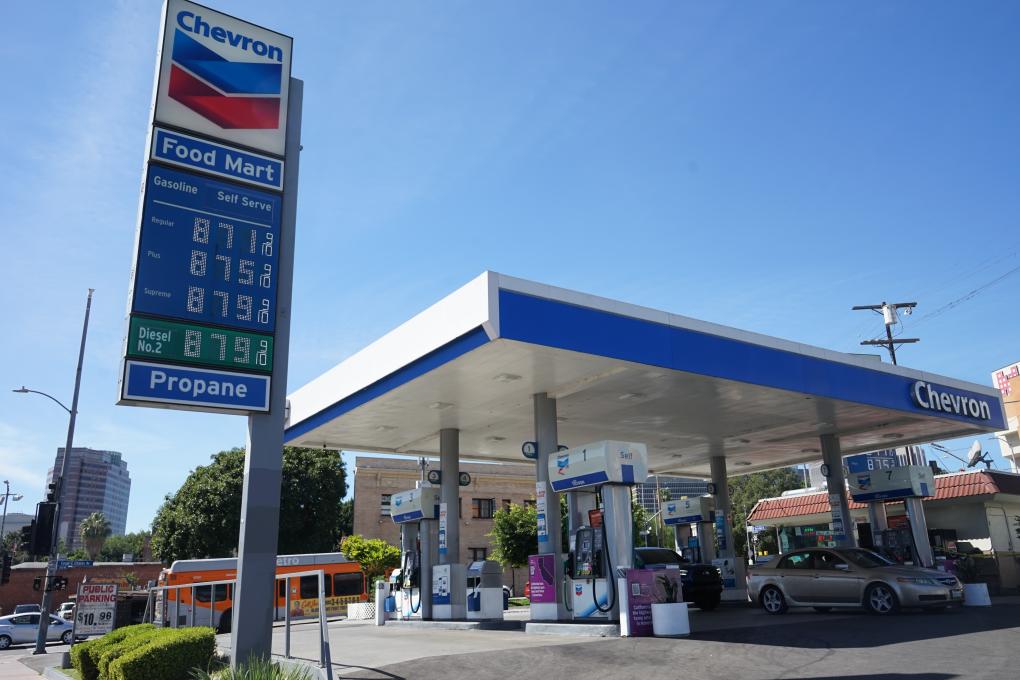 这是3月17日在美国加利福尼亚州洛杉矶市中心拍摄的一家加油站的油价牌。新华社发(曾慧摄)