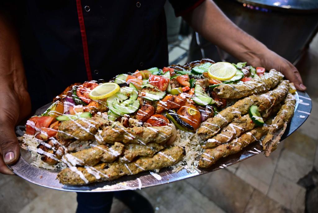 3月27日,在巴基斯坦南部城市卡拉奇,一家餐厅的服务员展示一盘烤肉菜肴。新华社发