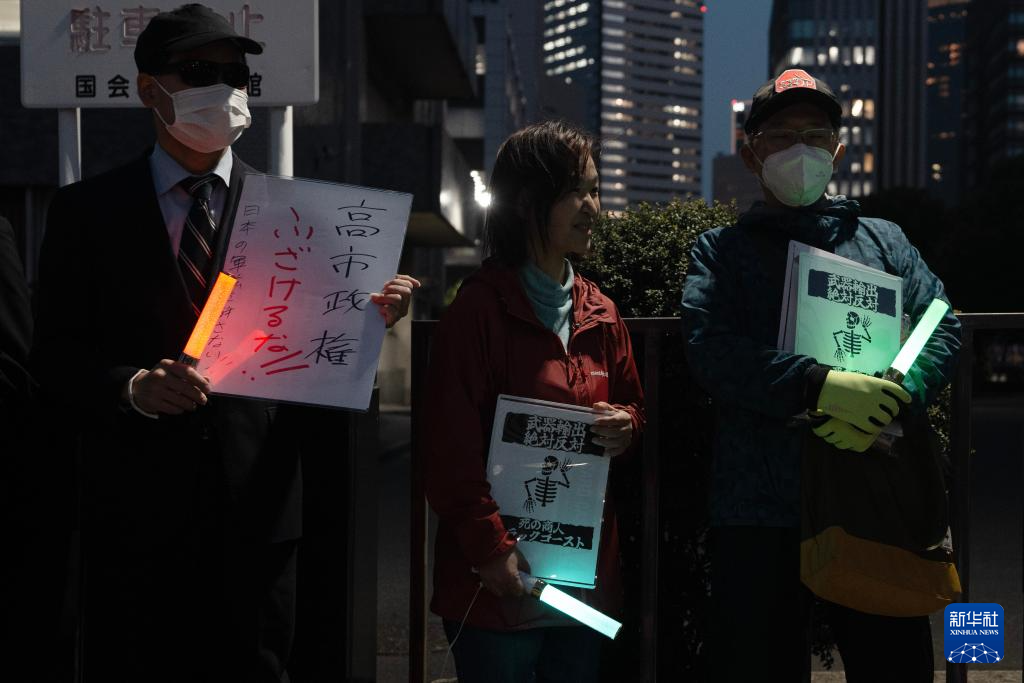 新华社东京4月16日电(记者陈泽安李林欣)针对高市早苗政府计划近期修改“防卫装备转移三原则”及其运用指南,日本民众16日晚在东京的首相官邸前举行抗议集会,反对解禁杀伤性武器出口。