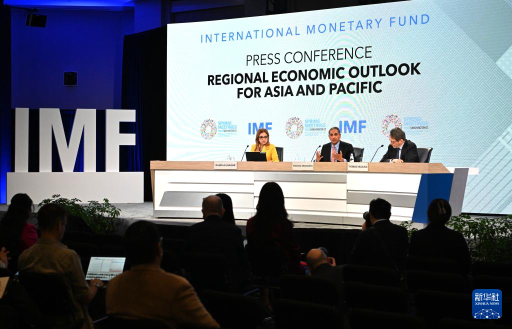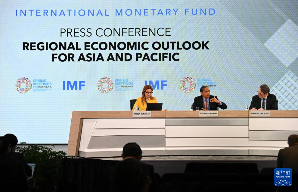 4月16日,在美国华盛顿,国际货币基金组织(IMF)亚太部主任斯里尼瓦桑(中)在新闻发布会上讲话。新华社记者 李睿 摄