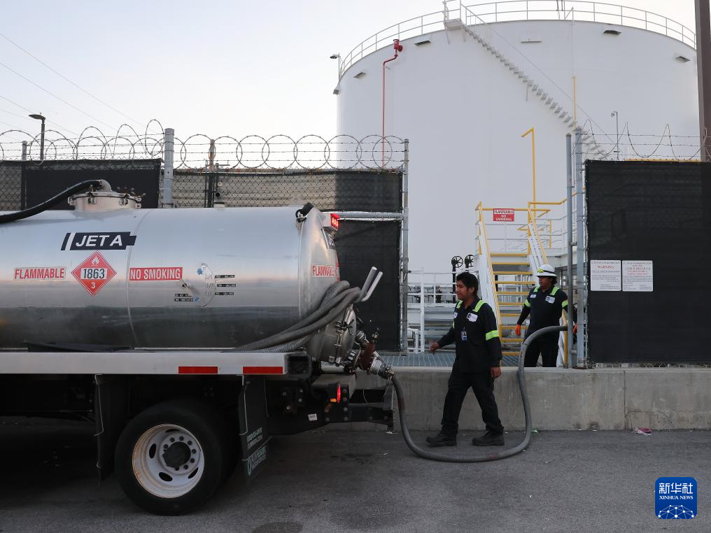 4月24日,在美国洛杉矶国际机场的航油站,工人为航空燃料油罐车注油。新华社发(邱晨摄)