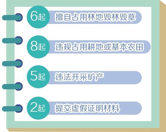 有5起违法开采矿产:包括河南省南阳市南召县达康实业发展有限公司以设施农业为名违法开采砂石37万吨;广西壮族自治区北流市委、市政府主导推动以工程建设项目施工名义违法开采砂石土等。另有2起提交虚假证明材料等违法违规行为。
