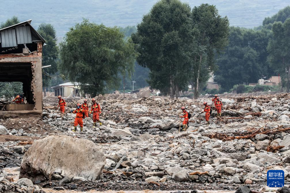 8月9日,在榆中县马坡乡马莲滩村,救援人员开展搜救作业。新华社记者 郎兵兵 摄