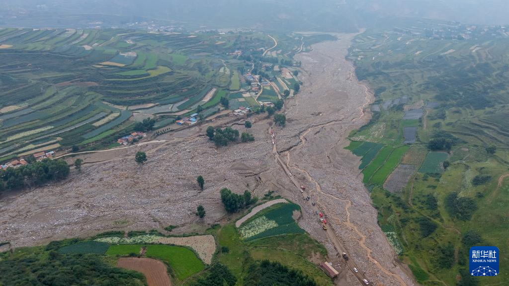 这是8月9日在榆中县马坡乡马莲滩村拍摄的山洪灾害现场(无人机照片)。新华社记者 郎兵兵 摄