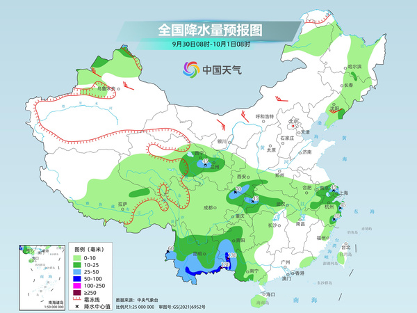 今天(9月30日),随着今年第20号台风“博罗依”减弱消散,广西、云南等地雨势也逐渐减弱,但局地仍有大暴雨。国庆中秋假期首日,我国降雨将再度发展,华西至黄淮局地有暴雨或大暴雨来袭,恰逢出行高峰,需防范道路湿滑和低能见度带来的不利影响。南方多地炎热持续,福建、浙江等地需警惕秋老虎,做好防暑措施。