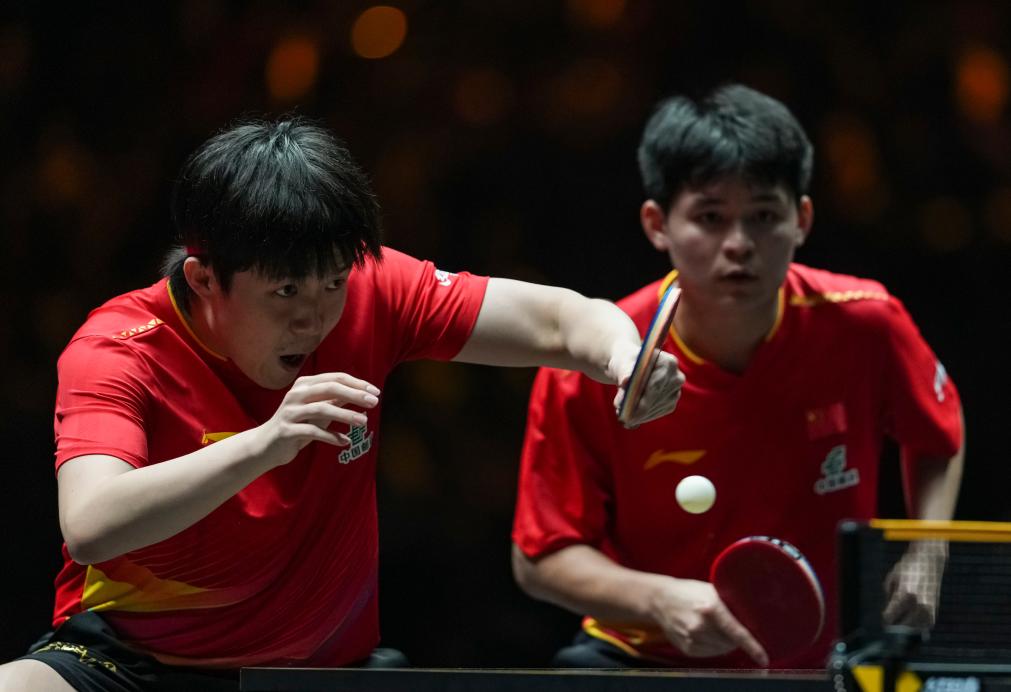 10月4日,林诗栋/王楚钦(左)在比赛中。新华社记者 孙非 摄