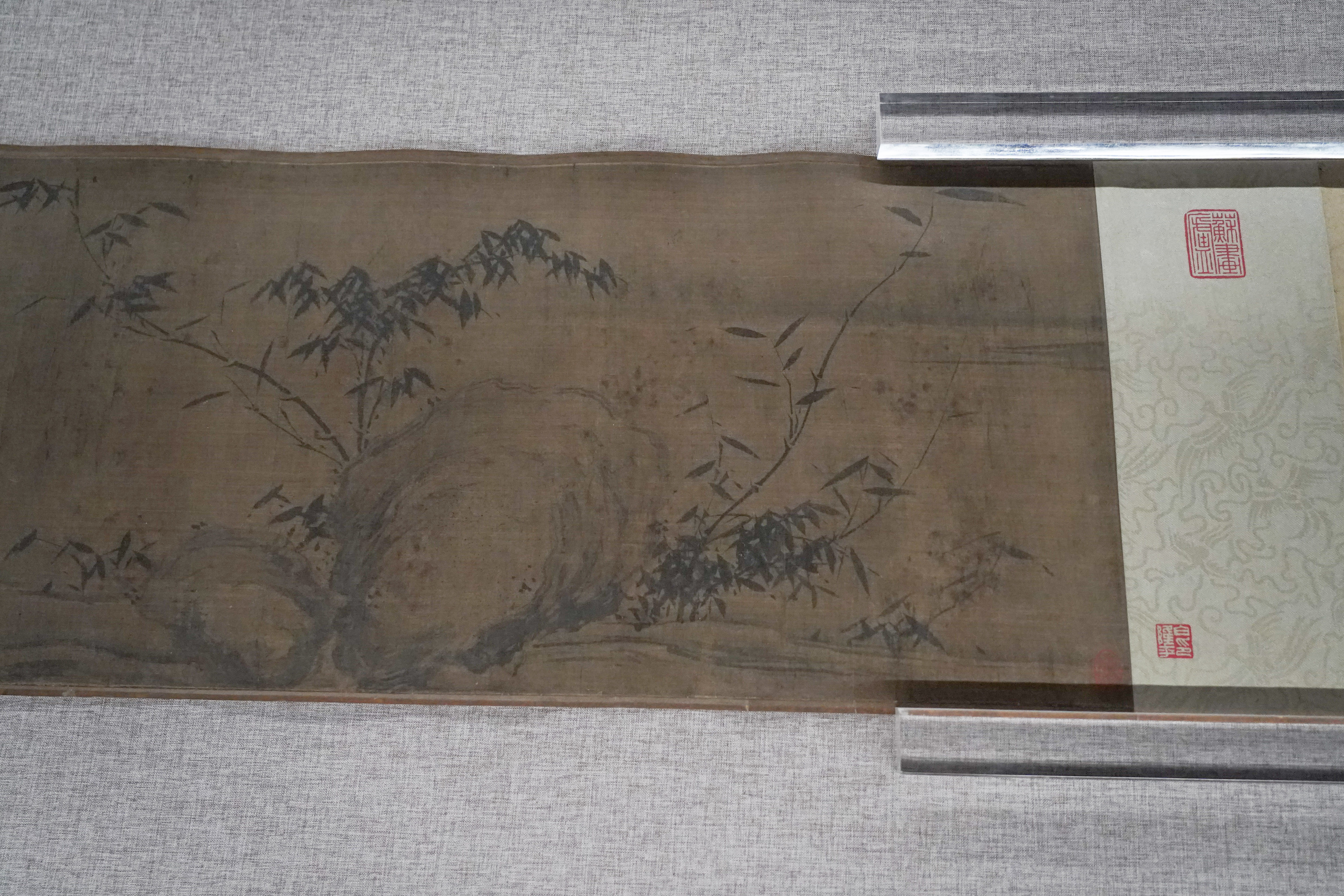走进夜间的中国美术馆,等待近距离观赏《潇湘竹石图》的观众从中厅排到了东厅。东坡先生笔下,峋石疏淡,野竹仙逸,烟云浩渺中尽显作者心境。观众们在观赏时不约而同打开手机镜头,在幽微的光亮前凝神屏息,一边欣赏一边拍照。窗外的黑夜与眼前的明灯之间,宛若架起一道通向文人精神深处的桥梁。