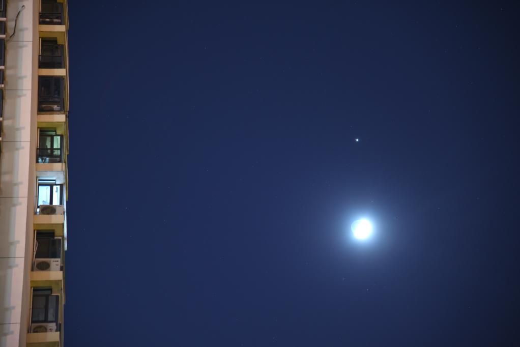 从地球上看去,木星伴月时两者距离很近,但实际上,木星距离地球的平均距离约7.8亿千米,月球距离地球的平均距离约38.4万千米,这场空中“相遇”是视角上的一种巧合,却成就了天宇的一份浪漫。