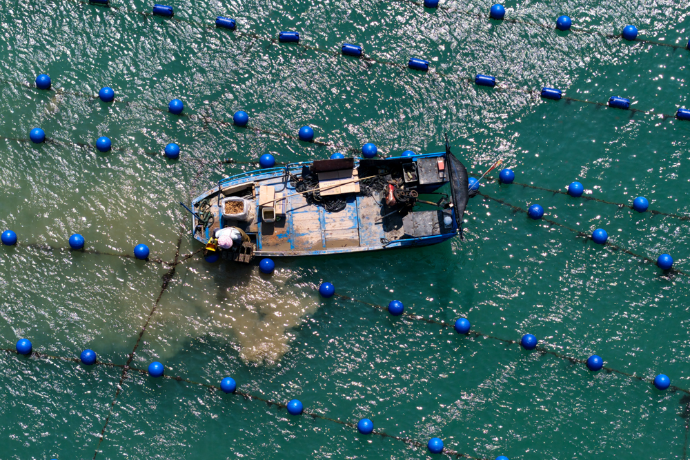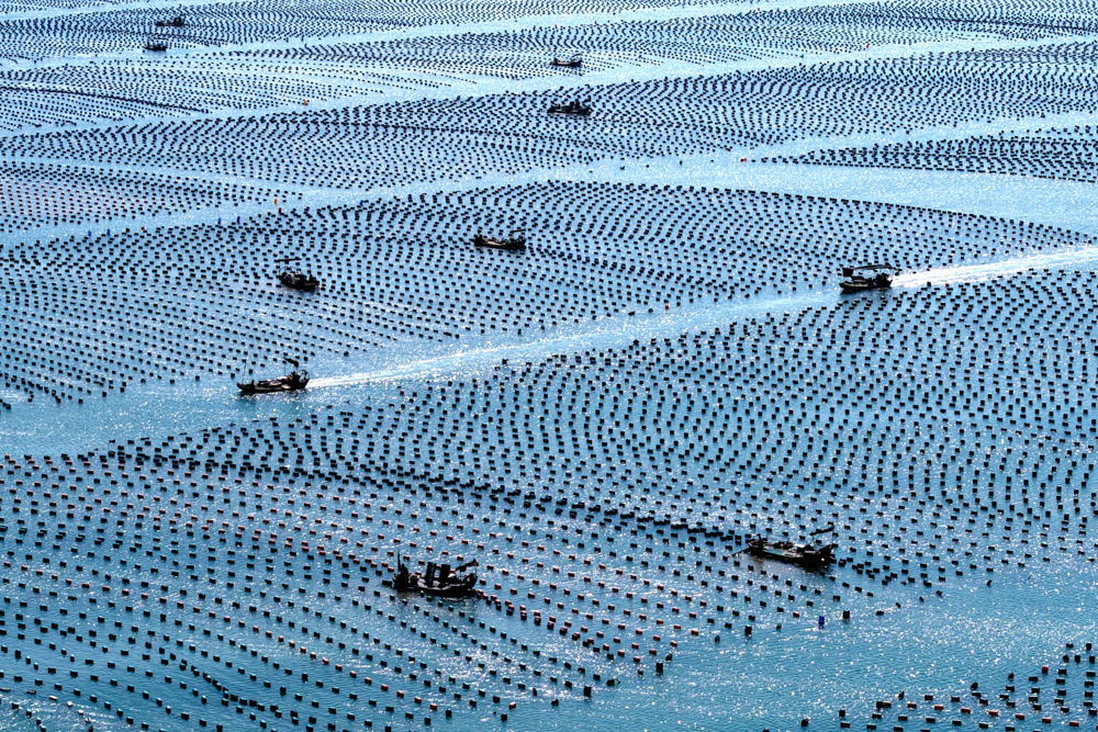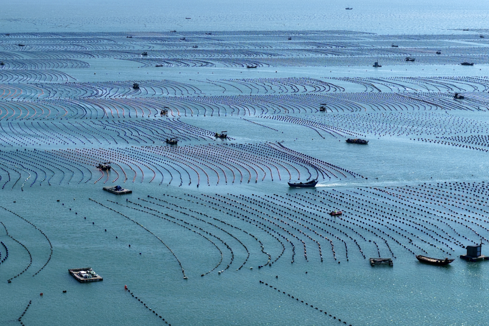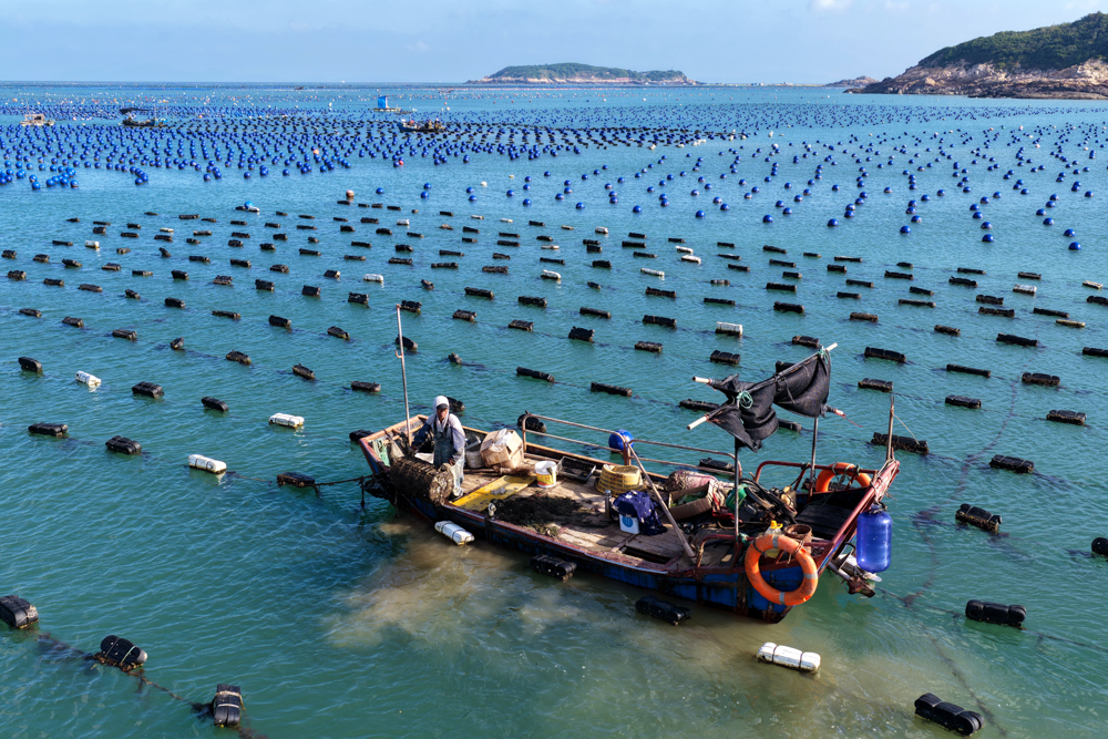 近日,福建省福州市连江县筱埕镇海域的海洋牧场呈现出一派繁忙的秋日海上耕作景象。