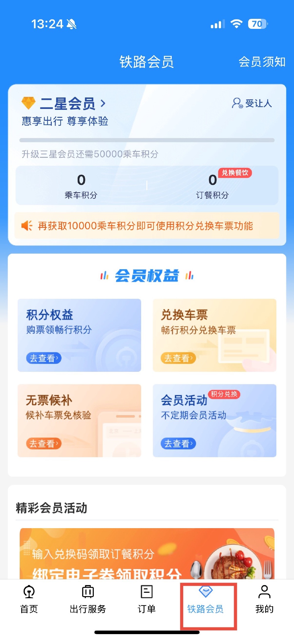 打开12306App,在最下方选择“铁路会员”一栏,进入后点击注册即可。一定要先注册并激活会员,再购票才能享受积分服务。