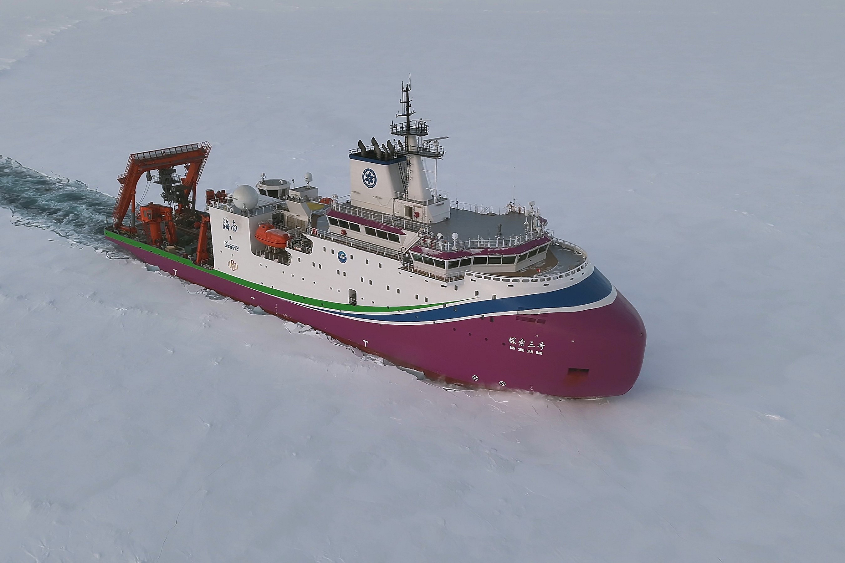 搭载着“奋斗者”号载人深潜科考队的“探索三号”于今年7月22日从三亚出发,会同“蛟龙”号载人深潜团队赴北冰洋海域执行深潜任务。其间,科考队在北冰洋作业56天,进行了一系列科学考察和试验。在海冰覆盖率大于80%的北冰洋中央海盆,科考队进行了国际上首次加克洋中脊的载人深潜科考,最大下潜深度达5277米。