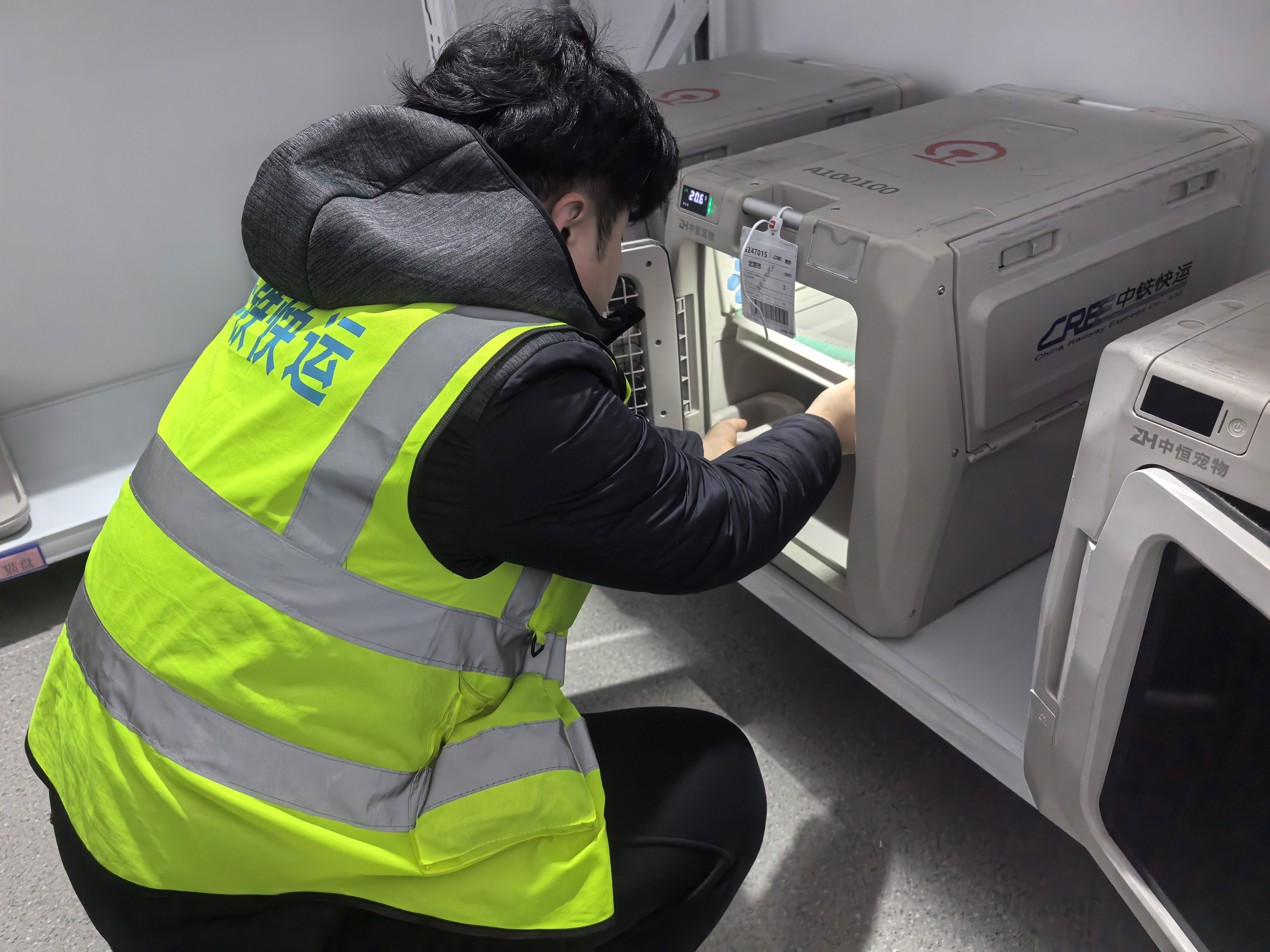 记者在采访中看到,宠物被托运过程中,全程处于专用的运输箱内。运输箱放置在高铁快运柜中,与旅客形成空间上的隔离。铁路工作人员介绍,这种运输箱自带空气循环系统,还带有含氧量、温度、湿度监测装置以及除味装置,既让宠物享受到专业呵护,又能保障其他乘客的乘车体验。