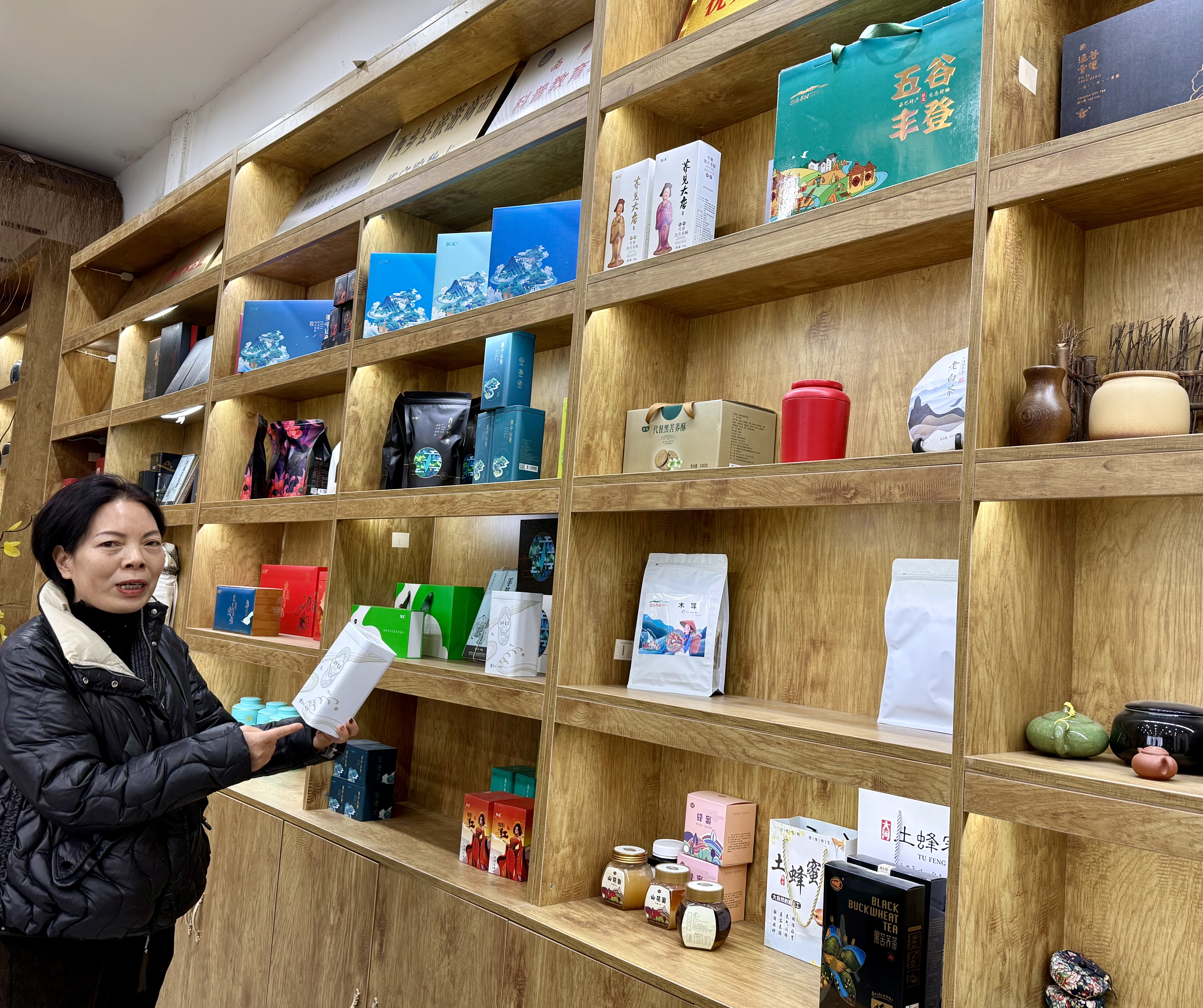来到村民刘海燕的茶叶公司,货架上,各类茶产品琳琅满目。53岁的刘海燕手脚利落,说话带着创业者的爽快。