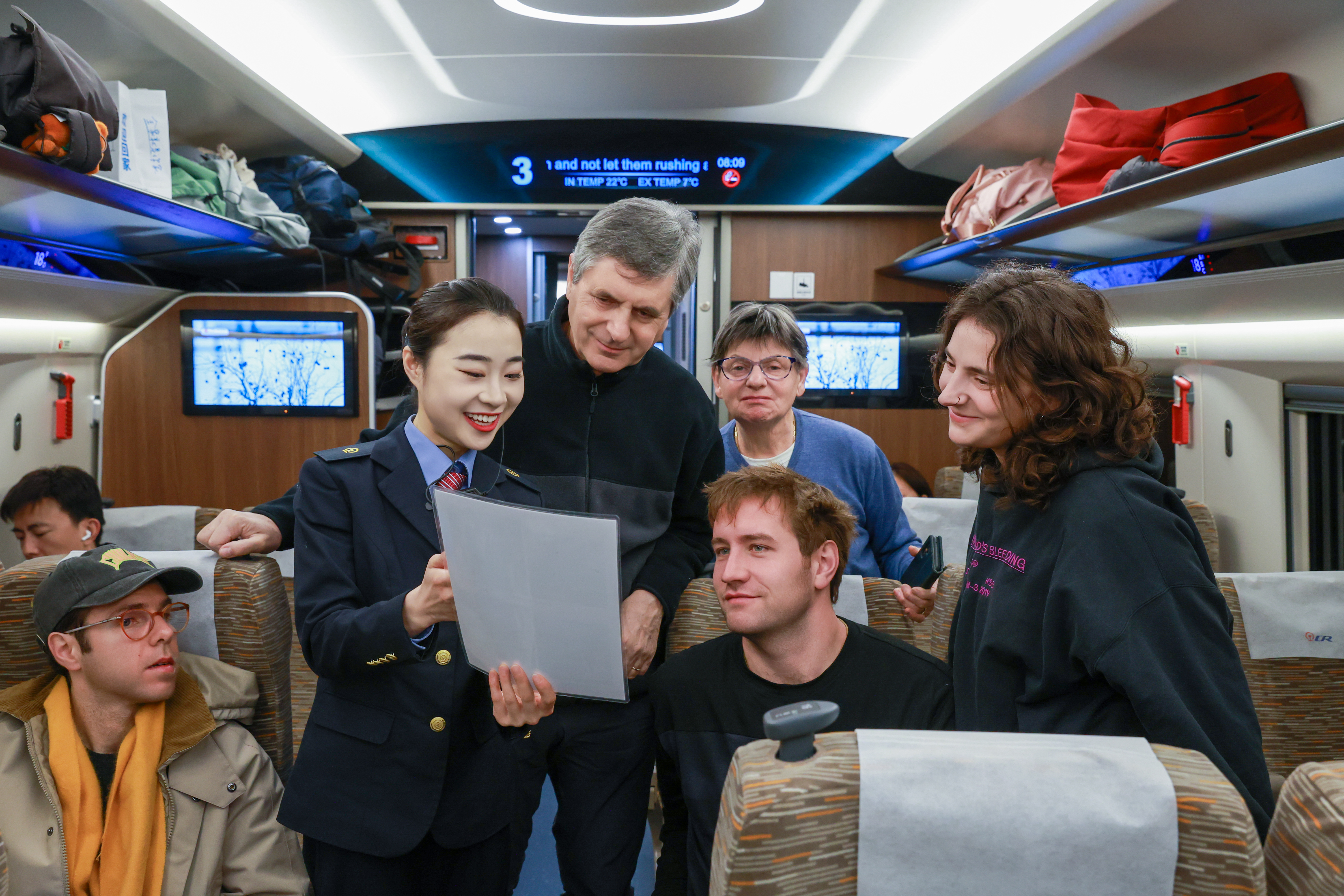 车厢外,沿途风光飞驰而过;车厢内,不同国籍的旅客间,轻松愉悦的氛围悄然流淌。彭程和她的小小笔记本,如同渝厦高铁上一个温暖的窗口,在春运的归途与旅途中,见证着一次次温馨的相遇,也让中国高铁的暖心服务,随铁轨延伸向远方。