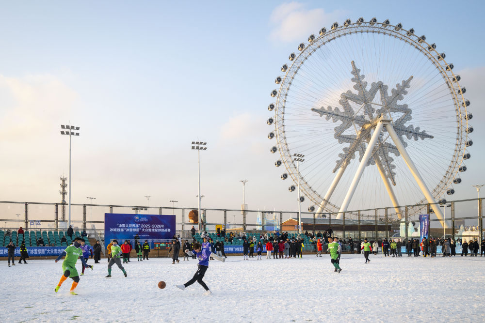 2025年12月20日,参赛球员们在哈尔滨市“冰超”系列冰雪赛事启动仪式暨“冰雪大世界杯”2025-2026年冰城首届“冰雪绿茵”大众雪地足球挑战赛中。新华社记者张涛摄