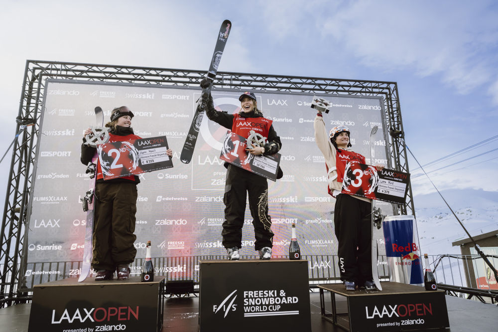 2026年1月17日,在瑞士莱克斯举行的国际雪联世界杯系列赛中获得女子自由式滑雪坡面障碍技巧冠军的谷爱凌(中)在领奖台上。新华社发(马塞尔·莱默希特摄)