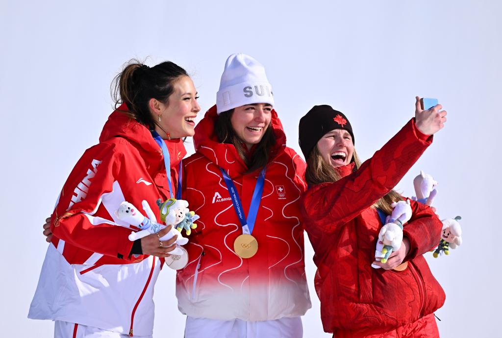 2月9日,瑞士选手玛蒂尔德·格雷莫德(中),中国选手谷爱凌(左)和加拿大选手梅根·奥尔德姆在领奖台上合影。新华社记者 张宏祥 摄