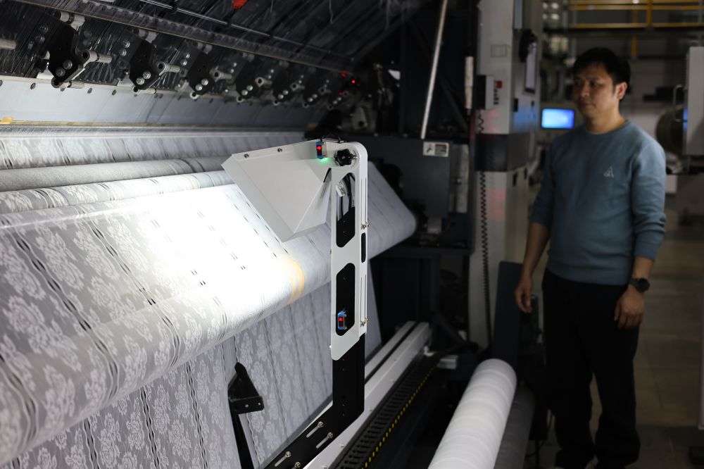 长乐区辅布司产业园纺织车间里,机器轰鸣声中,AI智能检测设备上的高清摄像头,正在对蕾丝花边产品“巡逻”拍照,影像上传到系统后台,算法自动比对,在控制面板上实时生成质量热力图,一旦发现产品出现破洞、断纱、偏针等问题,就会自动“停机”。