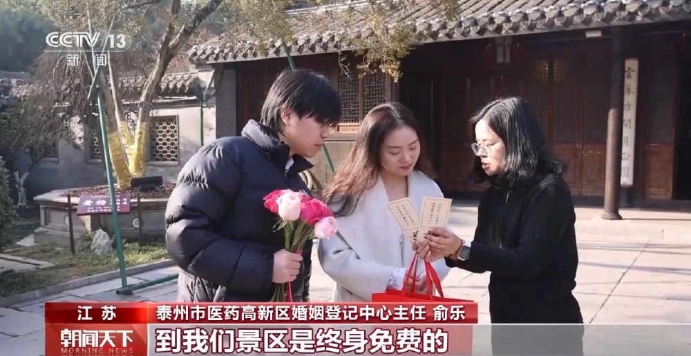 不久前,江苏泰州市雕花楼景区内的婚姻登记点正式对外开放,吸引了不少来自全国各地的新人来这里登记结婚。工作人员为新人们举行了集体颁发结婚证的仪式,送上甜蜜祝福和新春的祝愿,并为每对新人送上精心准备的甜蜜礼包,内含景区门票、文创纪念品等特色伴手礼。