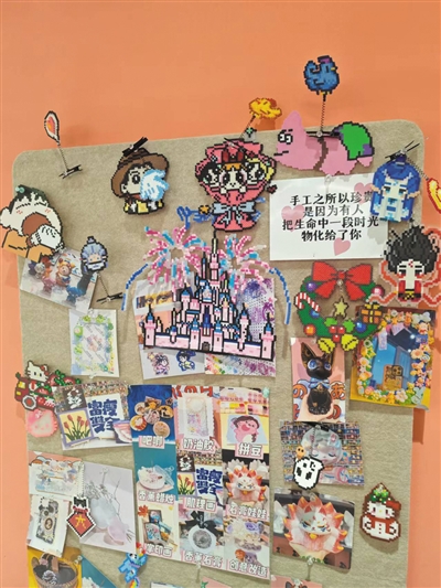 店内操作台前,正在制作动漫图案的张同学告诉记者,她和朋友经常相约前来体验拼豆制作,完成后的作品会带回宿舍摆放。“和朋友一起做这个,时间过得挺快。”她说。