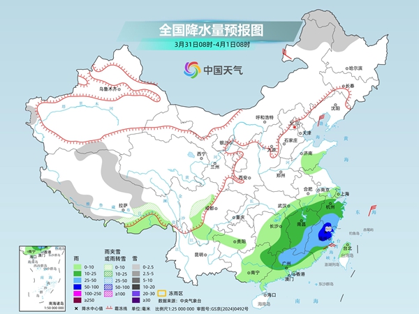 今明两天(3月30日至31日),南方仍有大范围降雨,雨带会逐渐东移南压,并伴有强对流天气。在冷空气和降雨的共同影响下,东北、华北至长江中下游等地气温陆续下滑,而华南地区炎热持续,局地或有高温天气出没。