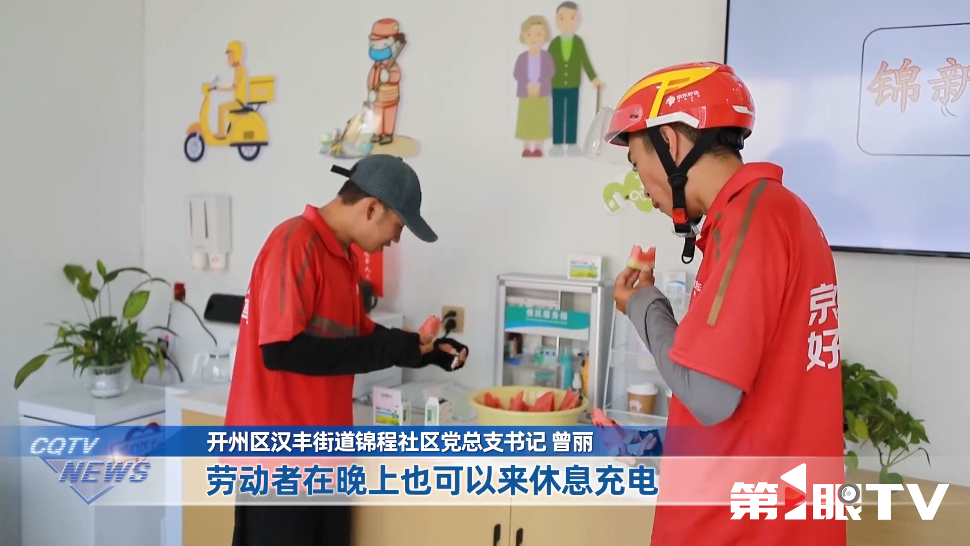 像这样的清凉保障,遍布整个山城。在梁平,劳动者港湾已设立35座,户外劳动者仅步行,就能很快抵达最近的歇脚点。在涪陵,志愿者深入辖区骑手驿站,为外卖小哥们送上“清凉礼包”。在开州,100多个工会驿站成了户外工作者的纳凉驿站,有志愿者还送来的免费的西瓜、绿豆汤、凉茶、避暑药品。这样的服务一直延续24小时。