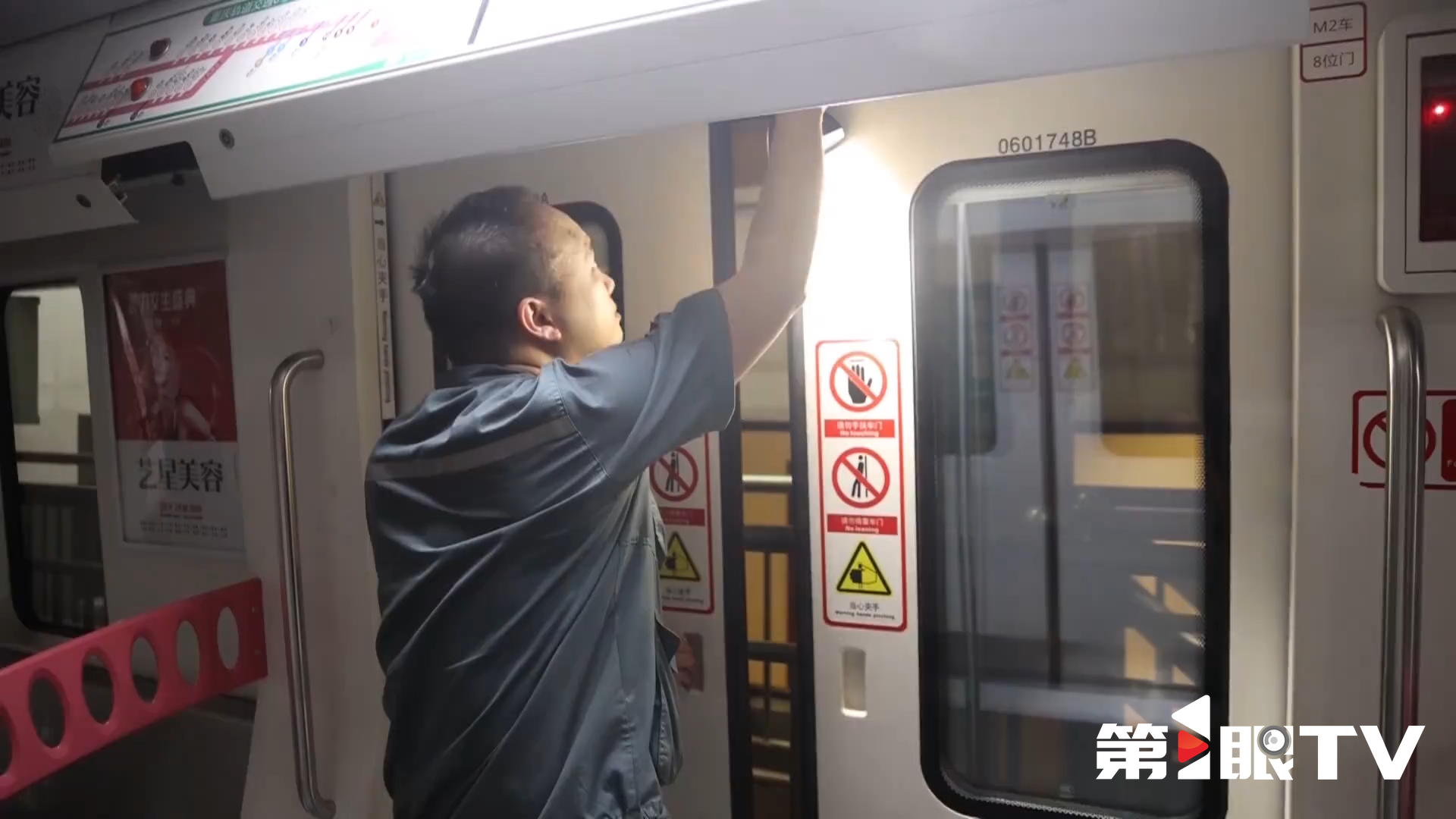 列车入库以后,检修人员分成车底、车内和车顶三组,同时进行检修作业。
