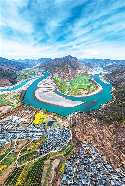 长江在云南省丽江市石鼓镇转弯,形成著名的“长江第一湾”。