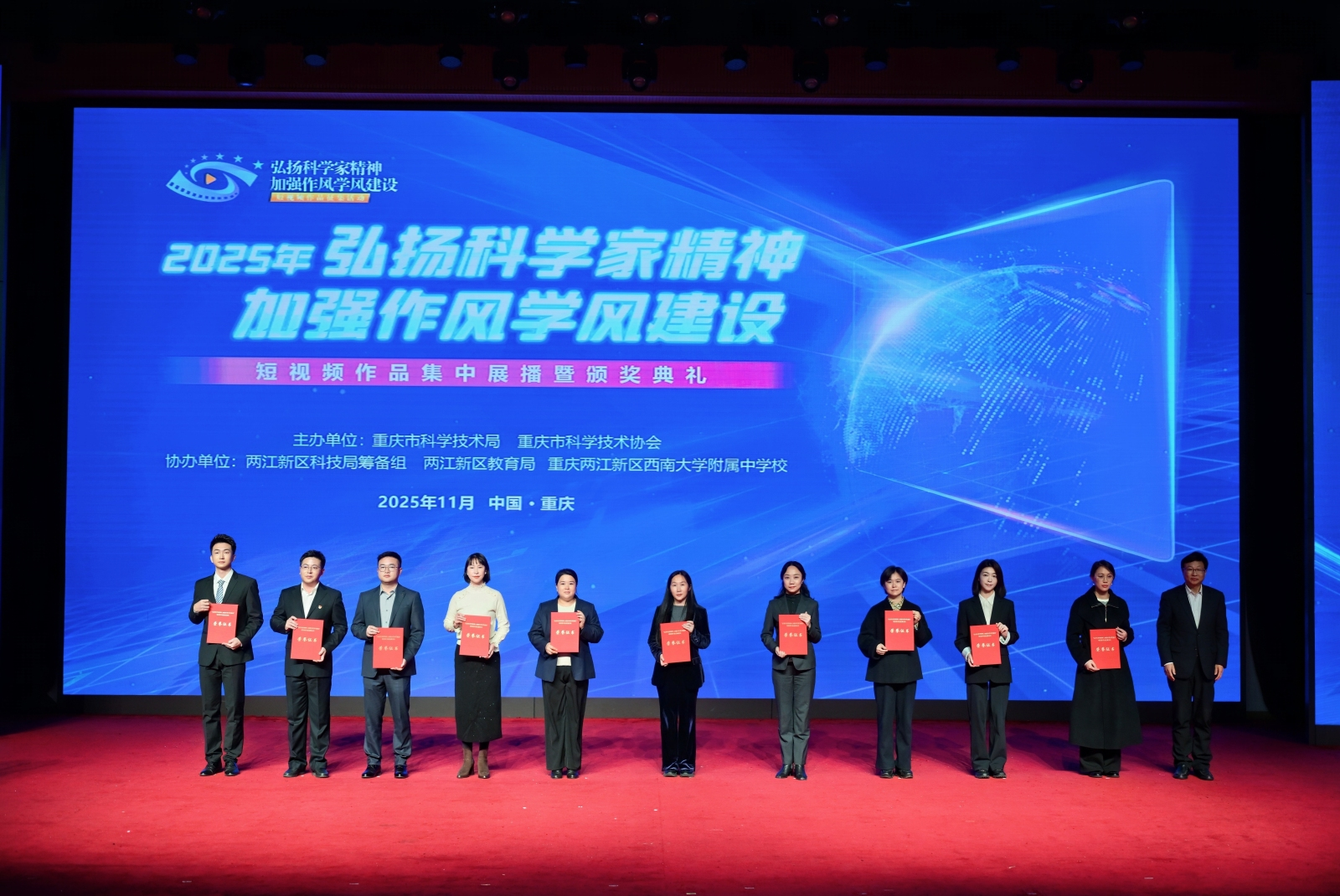 11月28日,由重庆市科学技术局、重庆市科学技术协会联合主办的2025年“弘扬科学家精神,加强作风学风建设”短视频作品征集活动集中展播暨颁奖典礼在重庆两江新区西南大学附属中学校举行。