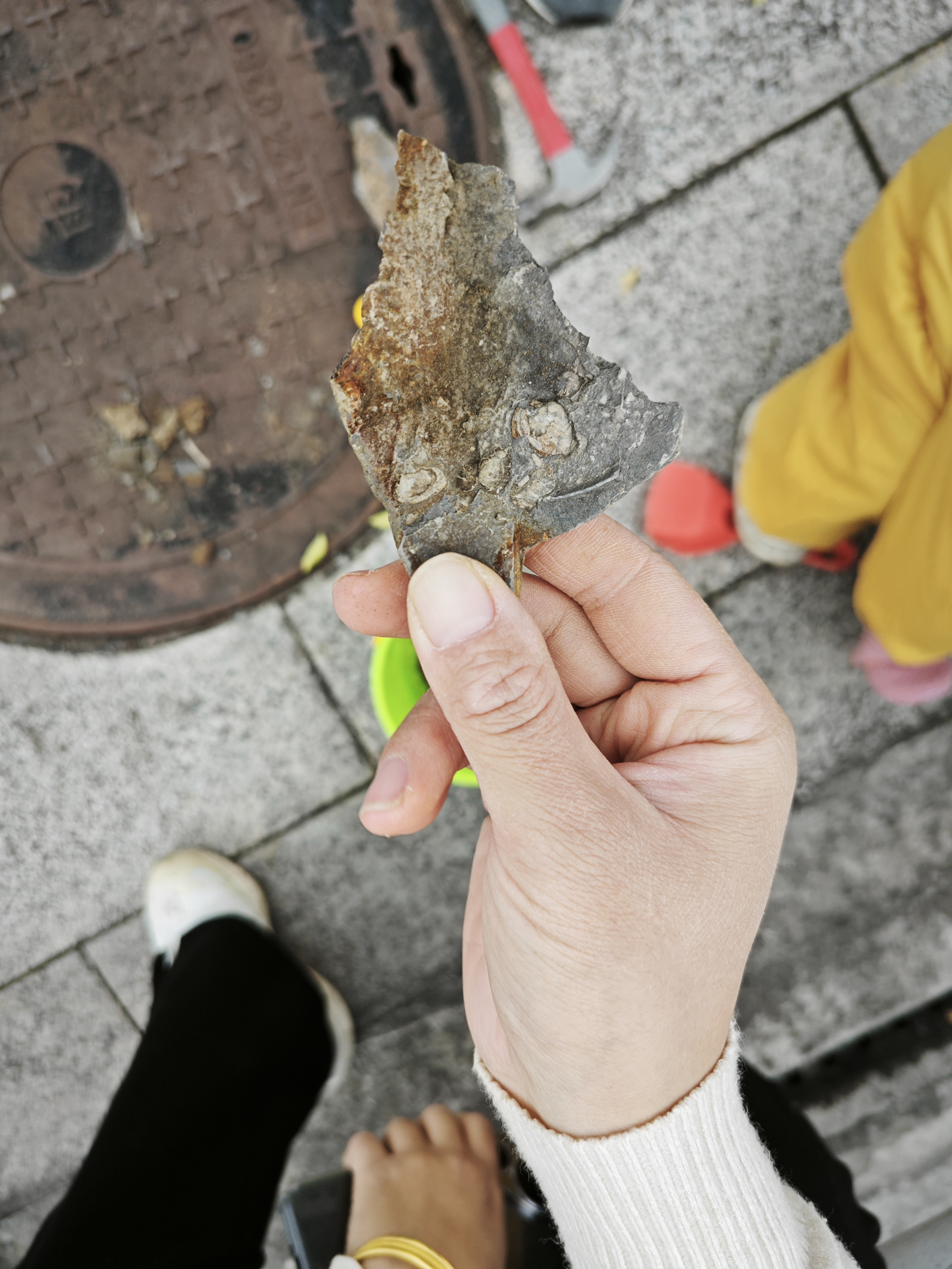不过,也有市民小有收获。一位带着金毛狗来遛弯的市民用石头砸开一块石板后,在内部发现了数个疑似贝壳化石的化石,引发围观。还有市民告诉记者,自己是带孩子过来感受下热闹,能否挖到化石并不重要。