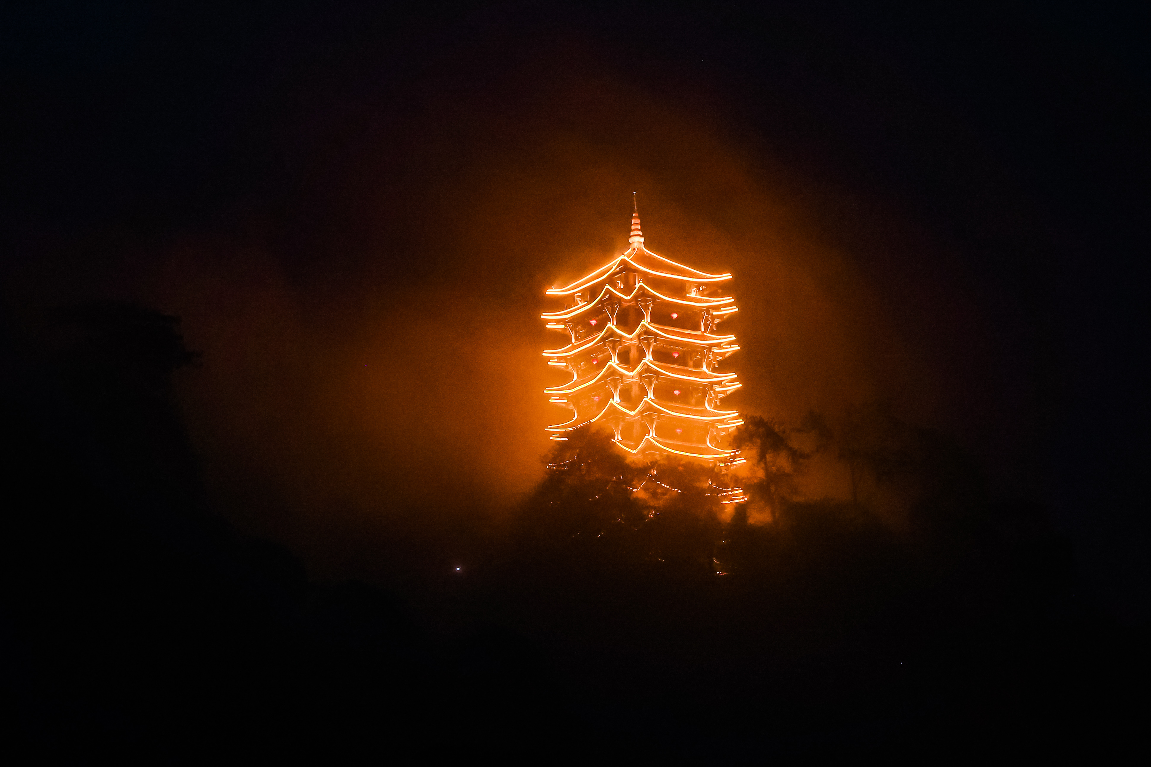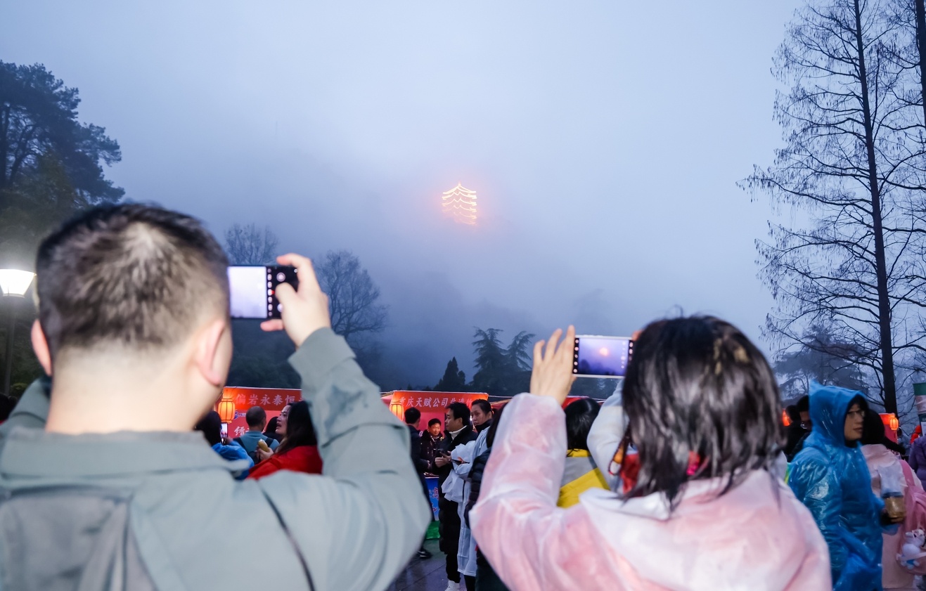 清晨六点半前后,首批登山者陆续抵达终点缙云山自然教育中心。此刻,东方既白,云海翻涌,缙云塔在云雾中若隐若现,金色灯光洒满山巅。现场响起阵阵欢呼,许多人举起手机,记录下这震撼的时刻。