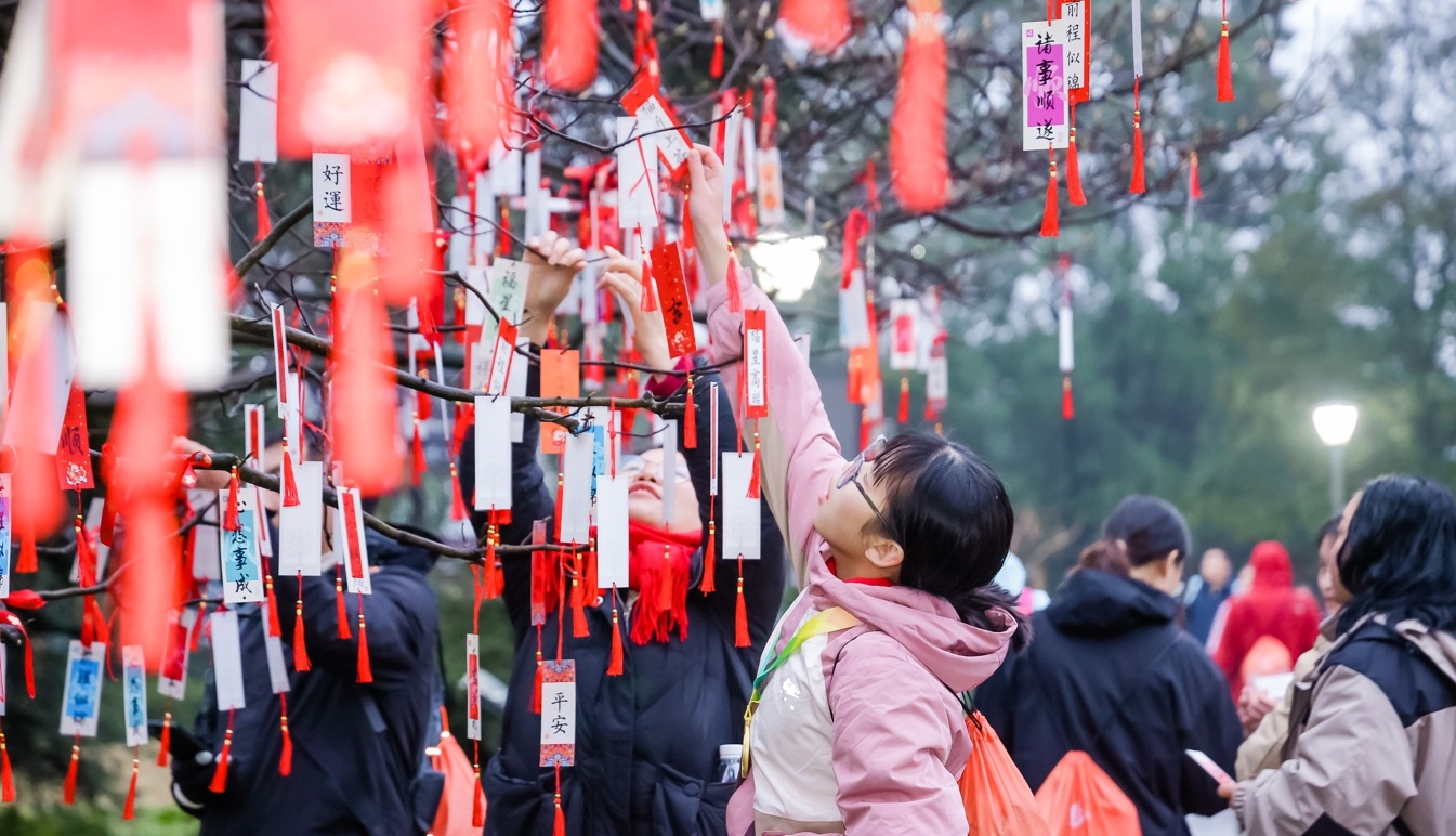 在登山终点的祈福区,参与者们敲响新年钟声,将写满心愿的红色祈福丝带系上许愿树。钟声悠远,红绸飘扬,寄托着人们对家国安康、生活美满的真诚祝愿。终点广场同时开设“马上大集”,提供热饮、小吃、非遗展示等服务,充满浓浓的节日烟火气。