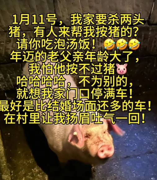 “1月11日我家要杀两头猪,有人来帮我按猪吗?请你吃刨猪汤!”重庆合川女生“呆呆”一句玩笑式求助,意外引爆全网热情——11日,上千网友闻讯前来帮忙。当天,杀了五头猪才算“了事”。
