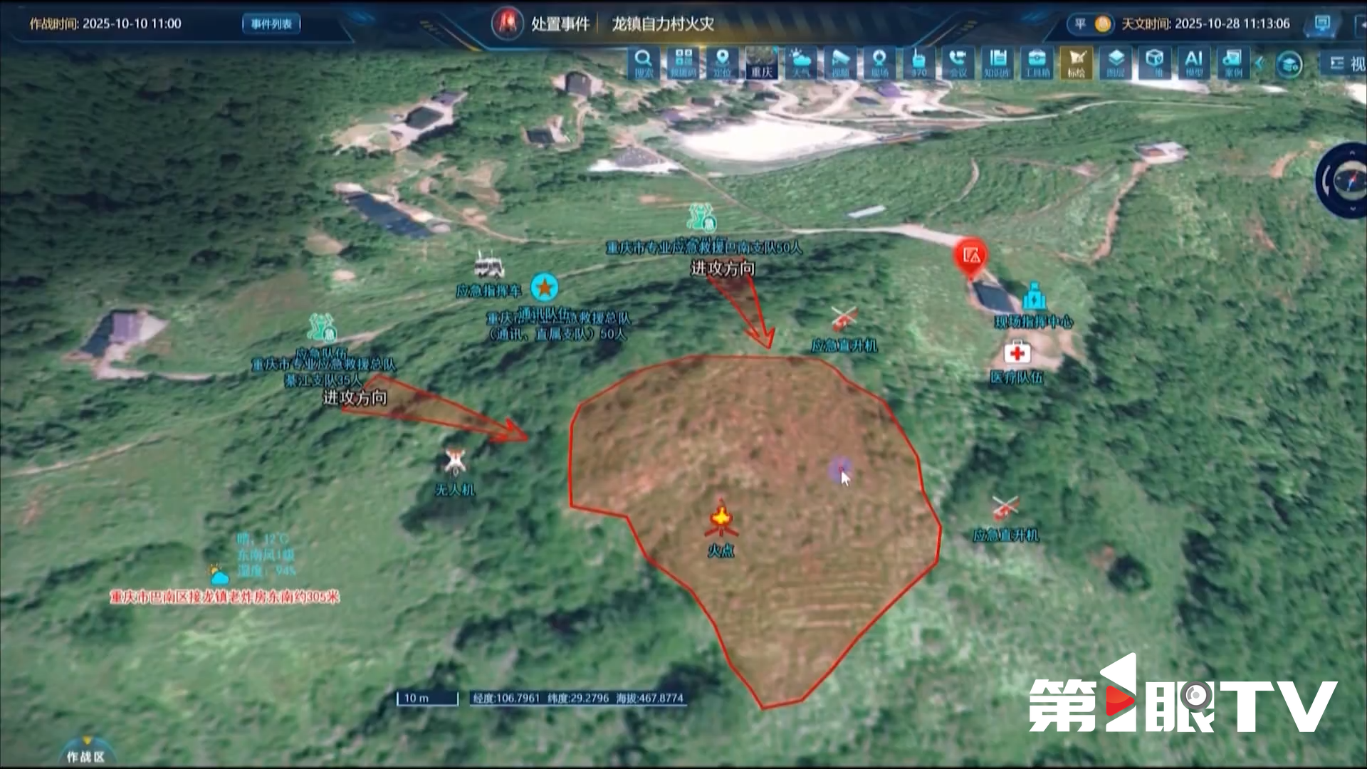 前段时间,巴南区接龙镇突发森林火情。摄像头自动捕捉画面并报警,护林员核实上报后,直升机、无人机与救援队员迅速出动。市应急指挥中心立即通过音视频融合系统,与前方救援力量建立了通信网络。覆盖空天地的多视角画面实时回传,为远程指挥作战提供支撑。系统的“数字孪生沙盘”功能,对火点周边地形、植被、水源等要素进行实景建模,结合火势蔓延预测模型,为现场指挥提供可视化决策支撑。由于反应及时、扑救科学,火灾很快被扑灭,未造成人员和重大财产损失。