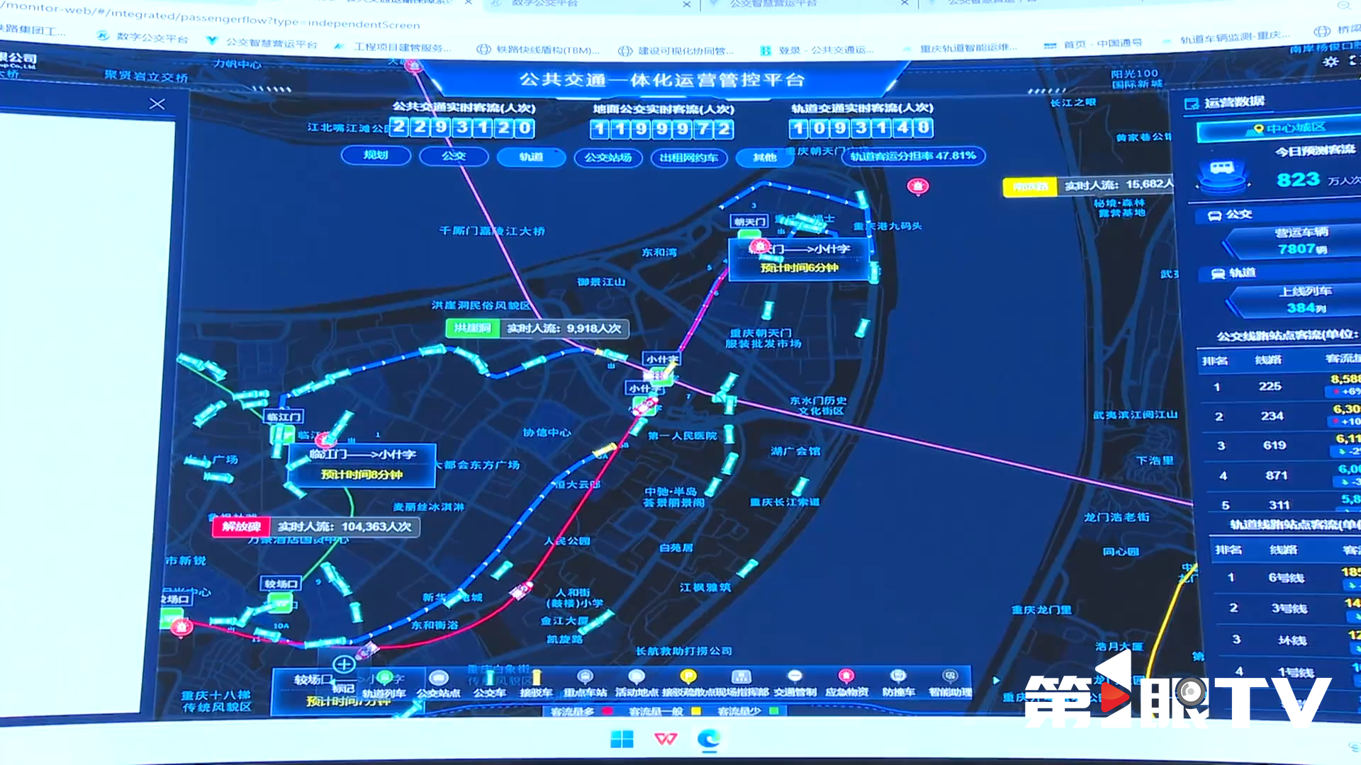 在公共交通一体化运营管控平台上,重庆中心城区的公交和轨道运行情况一目了然。平台还可模拟节假日客流大幅增长,开展线上演练。当接收到解放碑片区轨道小什字车站的红色报警, 提醒车站已超每小时最大疏运量,“智慧公交一体化疏运”程序立即启动,分析车站客流的主要流向,搜索周边闲置的公交运力,智能设计疏散路线,自动生成相应的公轨接驳疏散方案。从系统接收预警到方案确认执行,整体流程控制在15分钟以内,相较以往依赖人工分析数据,整体处置效率提升8倍以上。