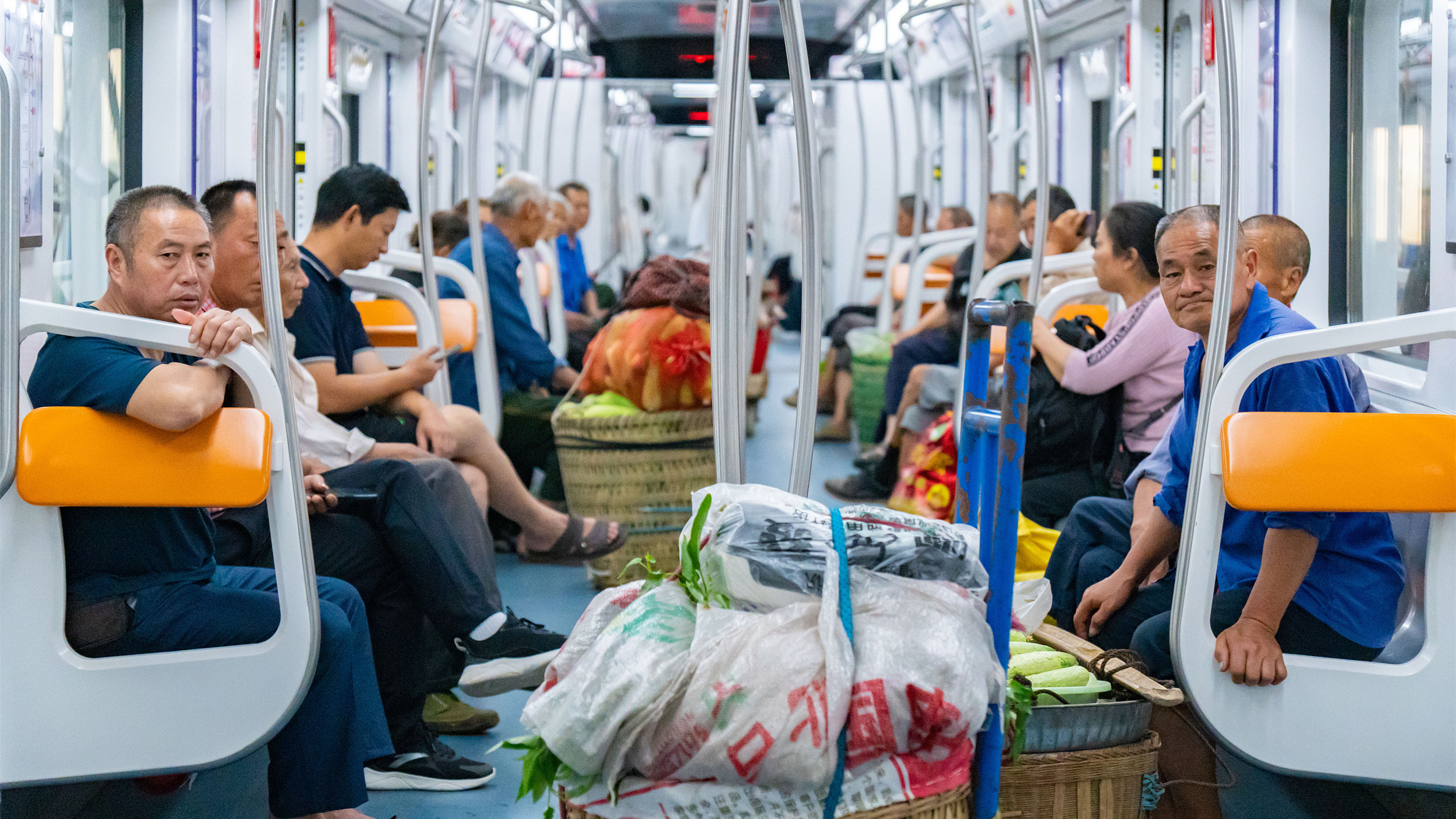 不仅仅是车上“背篓”多,更重要的是,由此升级的交通新图景:车站开闸,满满的背篓不用搬上搬下,工作人员“手动”安检。列车到站,背篓上下车,搭把手的人很多。背“背篓”的菜农们披星戴月出门,步行前往轨道站。能让他们的脚步再轻快一些吗?接驳公交线随即开通。