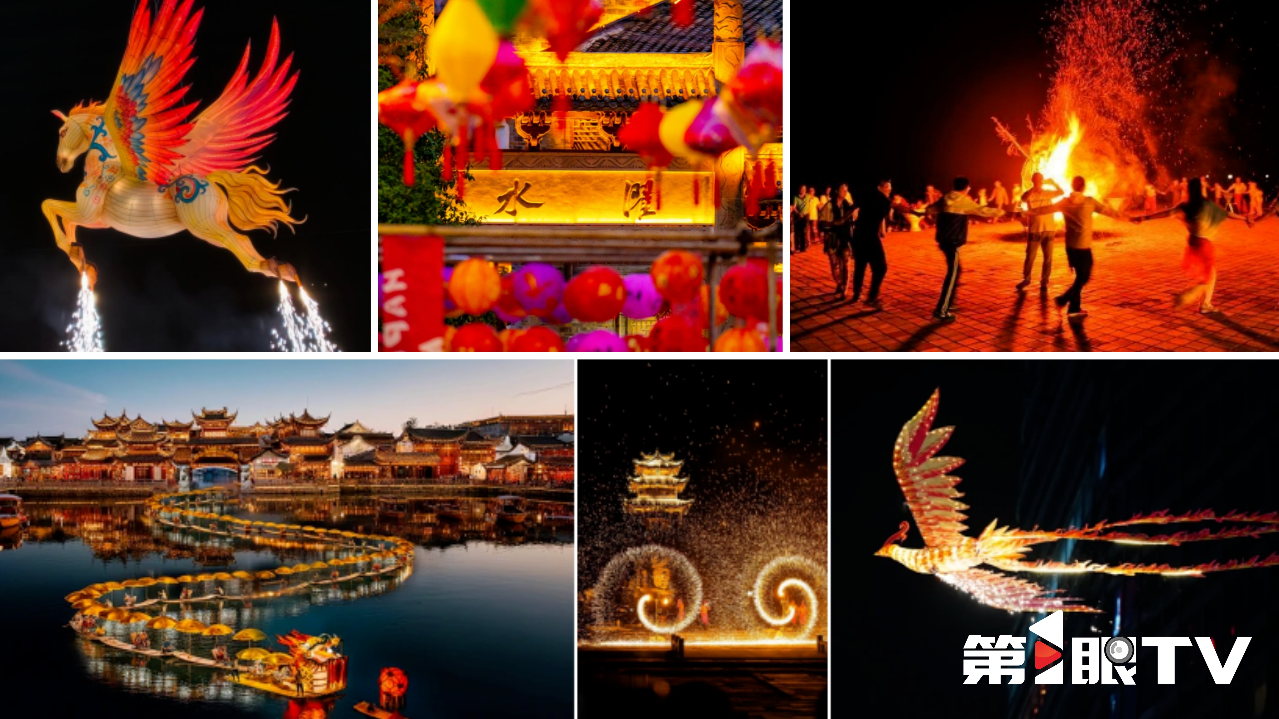 在黔江,濯水古镇水师码头与廊桥,春节假期每晚同步亮灯,亮灯后,“飞天凤凰与飞天马”无人机表演秀、“非遗打铁花”及“新春烟花秀”轮番上演,点亮阿蓬江的夜空。