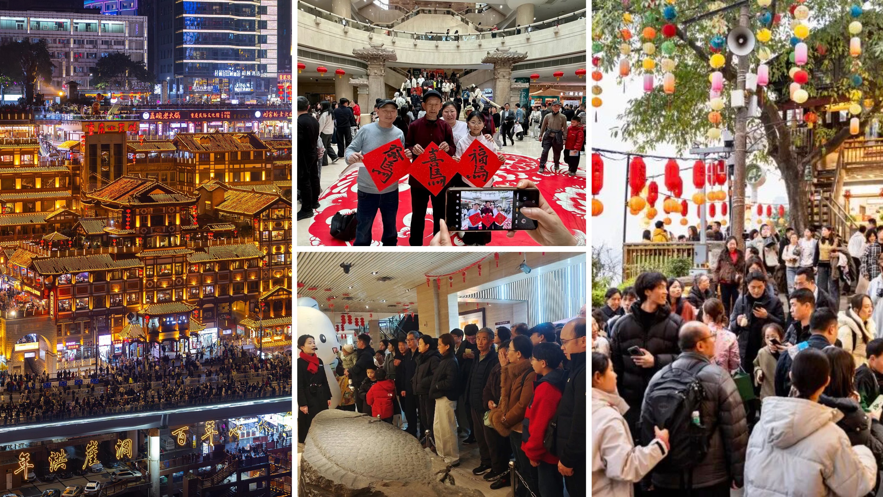 在渝中区十八梯传统风貌区,马年新春系列活动热闹开启,打灯笼、逛花街等传统民俗活动精彩不停。在巴南区木洞河街,巨龙翻腾,气势磅礴,市民游客追随着舞龙艺人,赞叹声、欢笑声连成一片。在两江新区渝味360碗国潮美食街区,非遗表演打铁花人气十足,滚烫的铁水在夜空中绽放成璀璨花火,寓意新的一年红红火火。