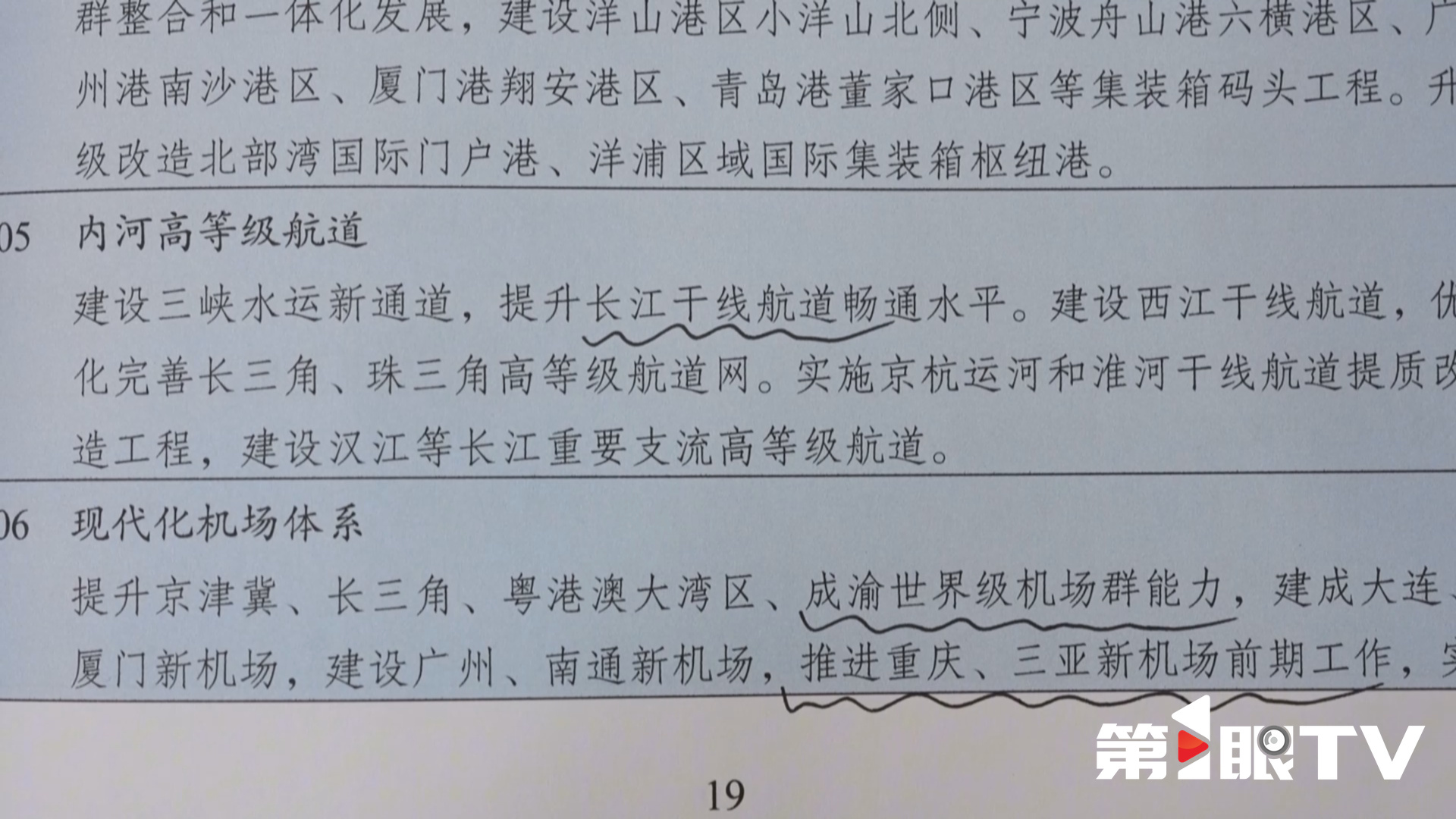 记者注意到,规划纲要草案中,多处明确涉及重庆。除了在政府工作报告中已经出现过的国家战略,还能看到很多和重庆直接相关的具体项目:比如,“研究建设重庆新机场”、“建设川渝天然气基地”,推进包含成都-重庆在内的中欧(亚)班列集结中心等等,布局长远、落点精准。