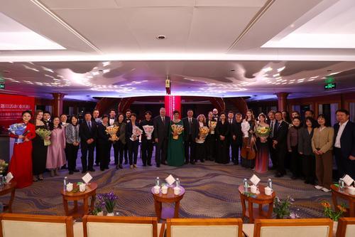 2026年3月18日晚,渝中区朝天门“时光号”游轮,“乐融中俄·新韵重庆”——2026年重庆师范大学重庆柴可夫斯基音乐学院游轮音乐会现场,中外嘉宾合影留念。 记者 尹诗语 摄